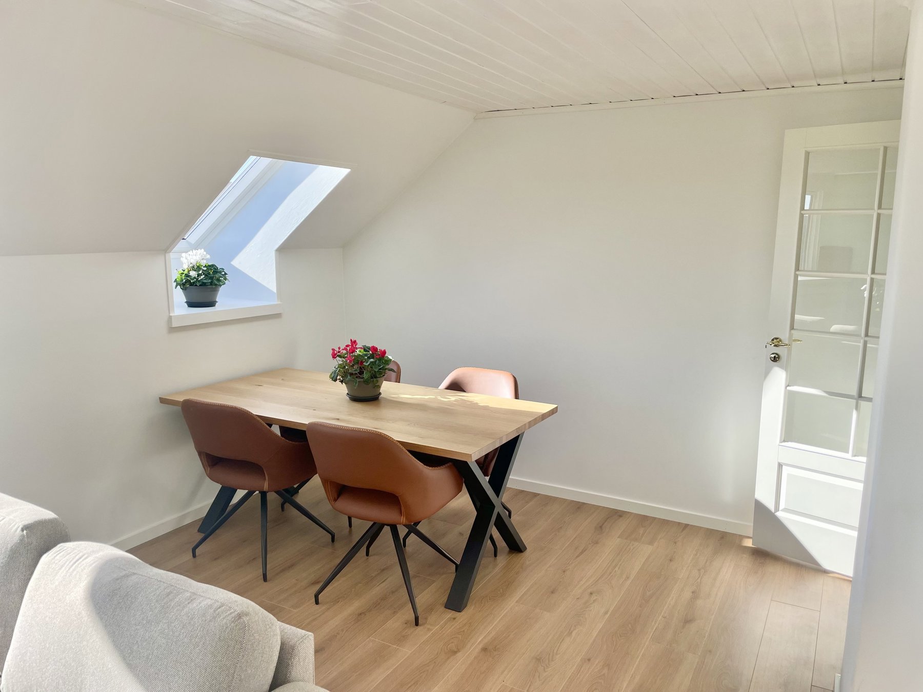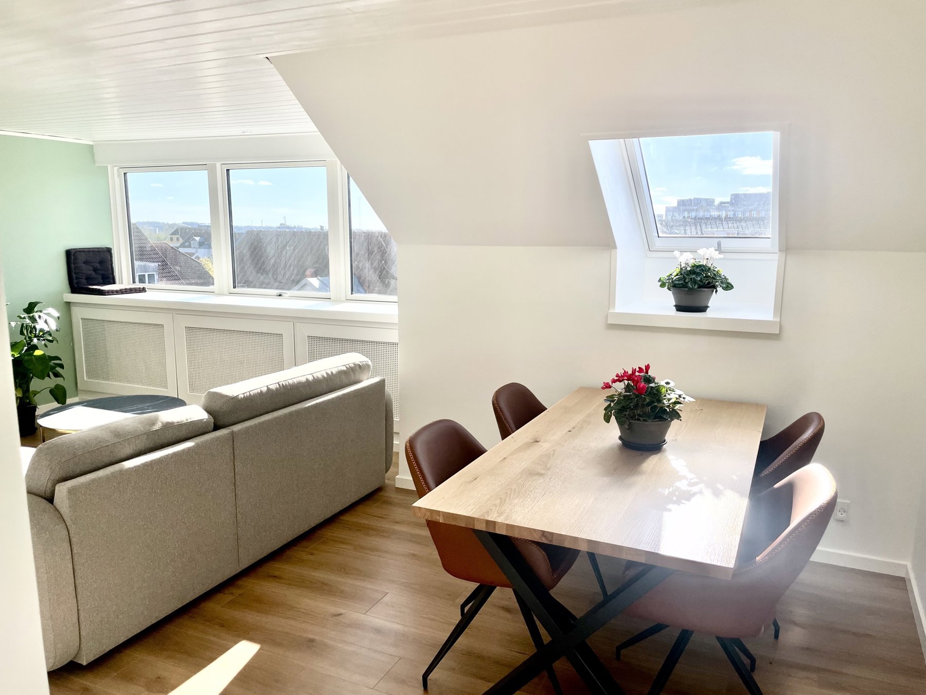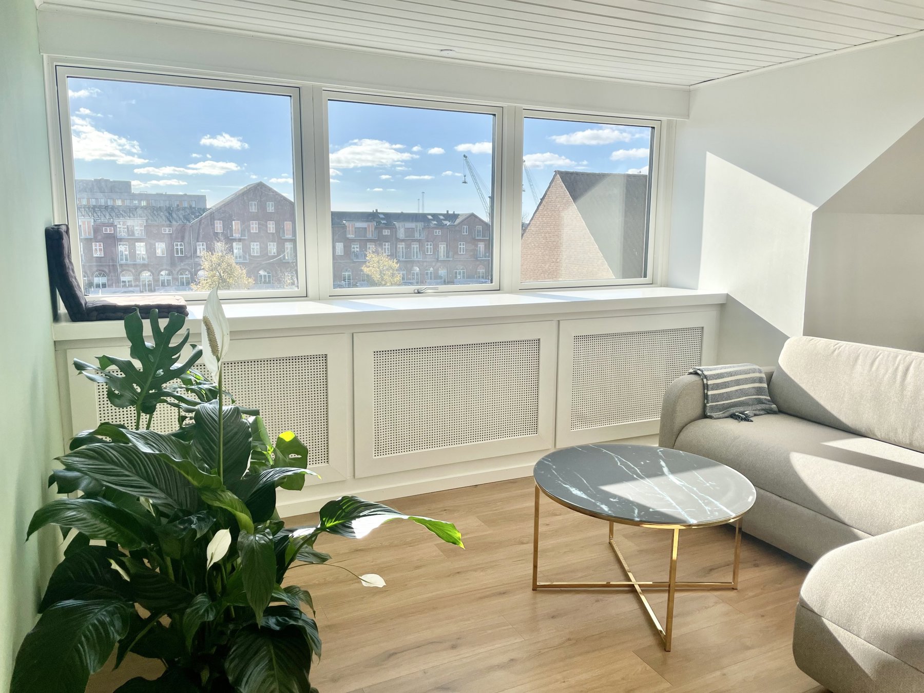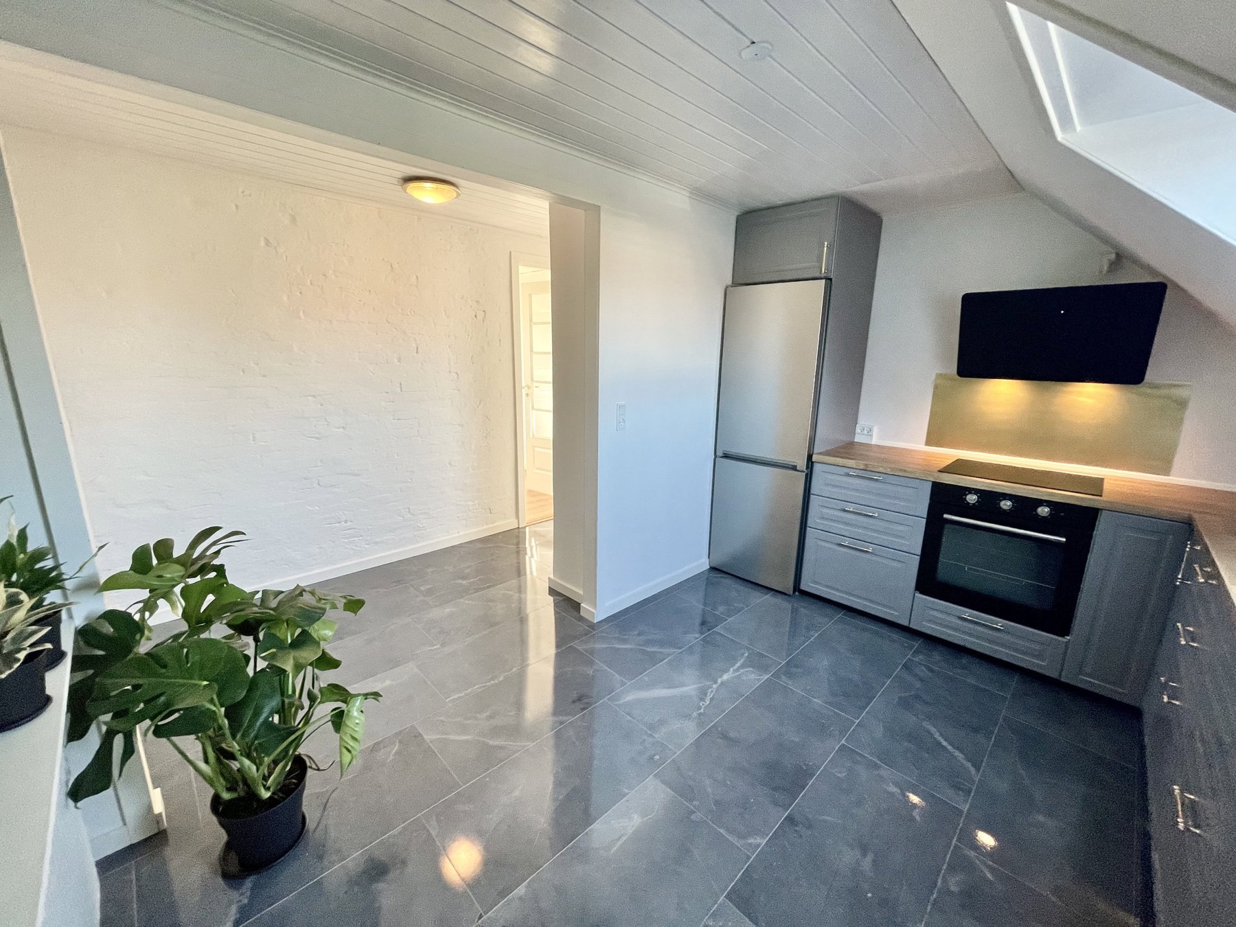 Indretningen er først og fremmest helt ny, og udført i lettere romantisk stil. Køkkenet er forholdsvist rummeligt og i åben forbindelse med entré og fordelingsgang. Der kan etableres en mindre spiseplads, men stuen er i sig selv også stor nok til en spiseafdeling udover indretningen som dagligstue. Et fantastisk lysindfald kommer bl.a. fra en ca. 3 meter lang sydvendt kvist med en kraftig vindueskarm, der i øvrigt er dyb nok til indretning som et slags møbel – eller bare et hyggeligt sted, hvor man slapper af, mens øjnene glider langsom hen over byens tage og ned over havneområdet, hvor de til sidst får et lille “kik” af Lillebælt med Fyn og Strib i baggrunden.