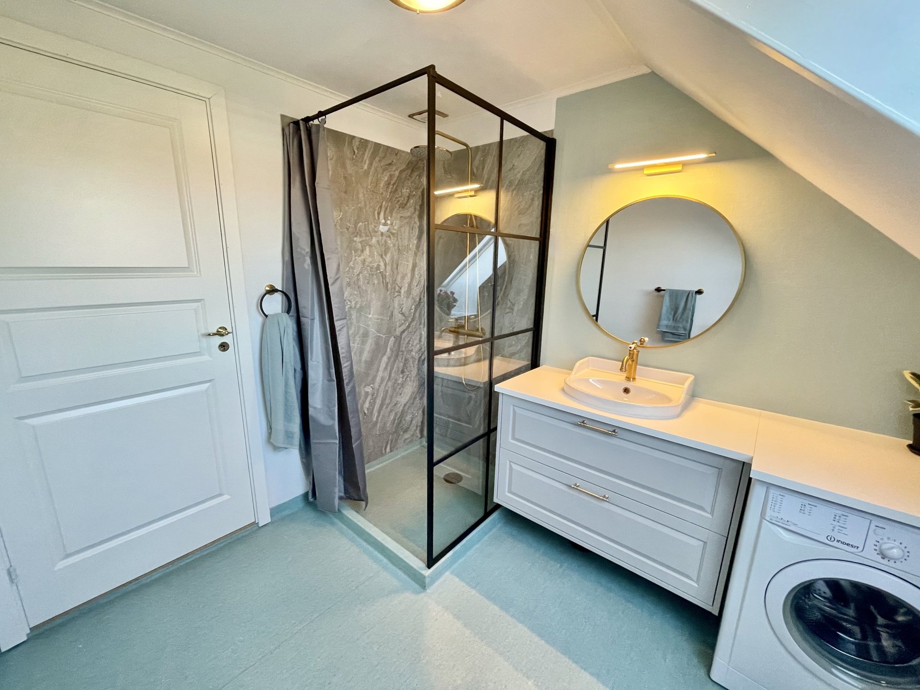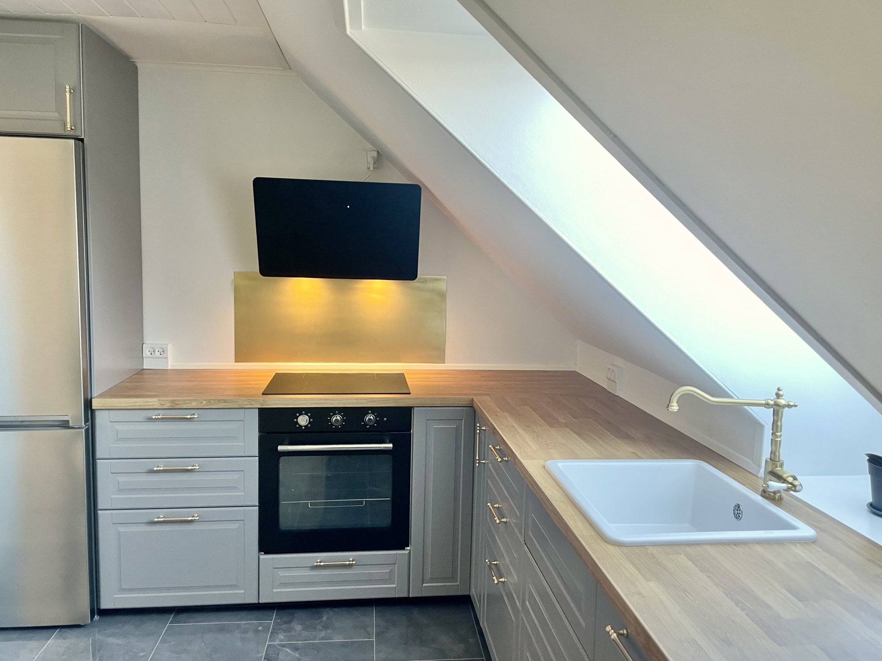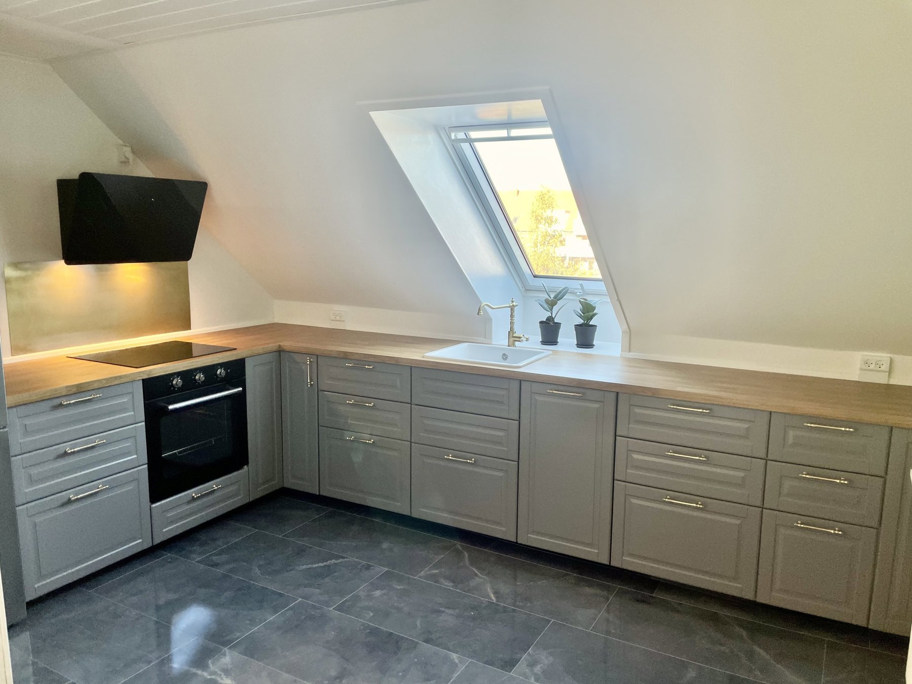 Indretningen er først og fremmest helt ny, og udført i lettere romantisk stil. Køkkenet er forholdsvist rummeligt og i åben forbindelse med entré og fordelingsgang. Der kan etableres en mindre spiseplads, men stuen er i sig selv også stor nok til en spiseafdeling udover indretningen som dagligstue. Et fantastisk lysindfald kommer bl.a. fra en ca. 3 meter lang sydvendt kvist med en kraftig vindueskarm, der i øvrigt er dyb nok til indretning som et slags møbel – eller bare et hyggeligt sted, hvor man slapper af, mens øjnene glider langsom hen over byens tage og ned over havneområdet, hvor de til sidst får et lille “kik” af Lillebælt med Fyn og Strib i baggrunden.