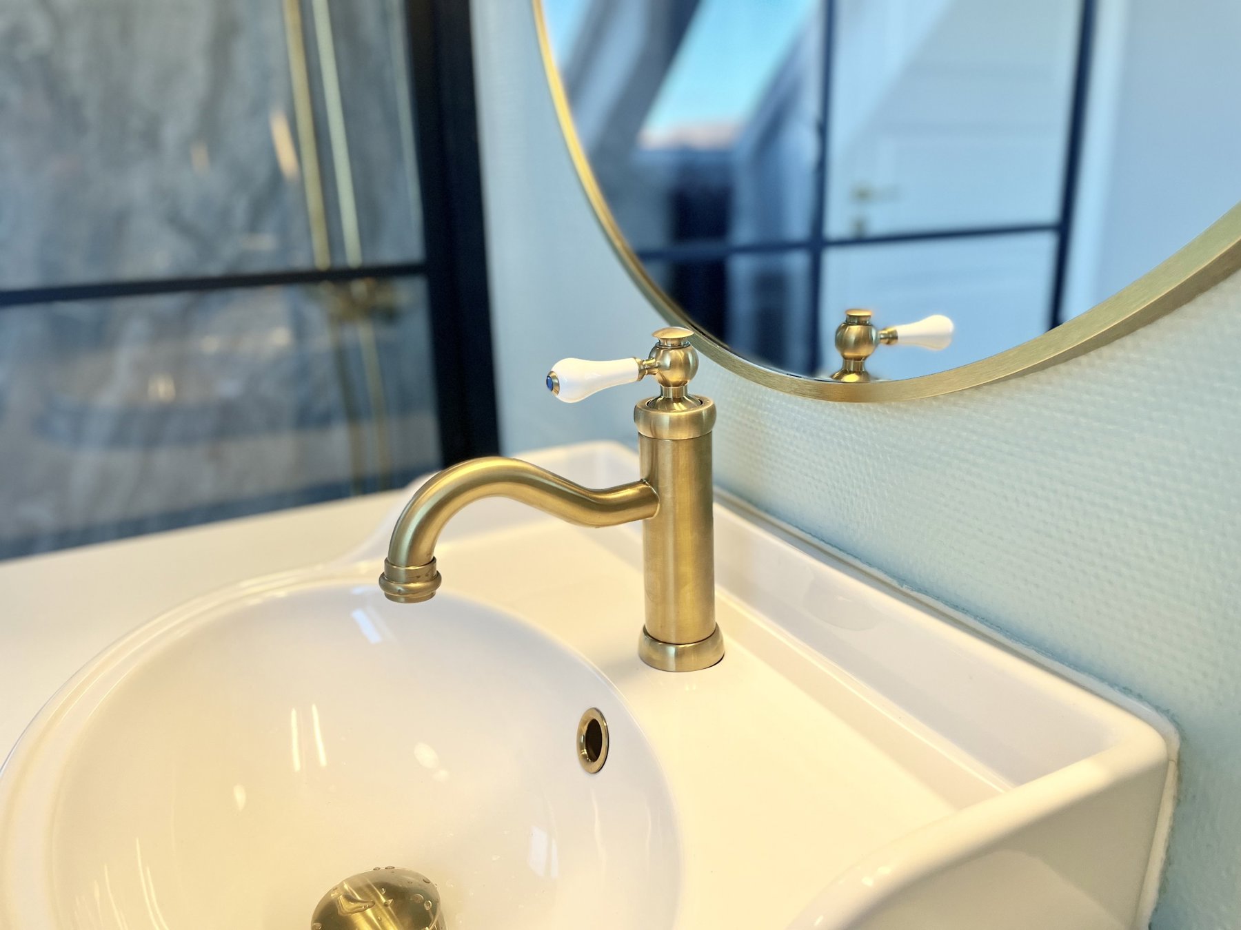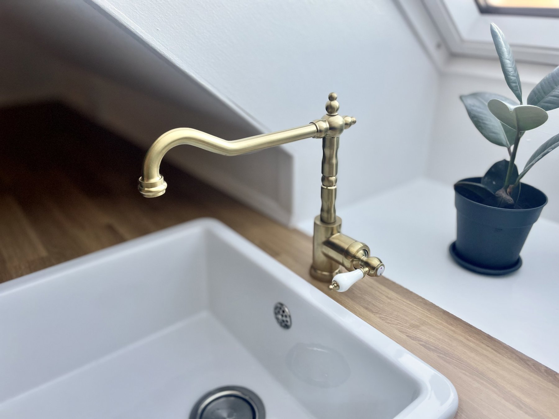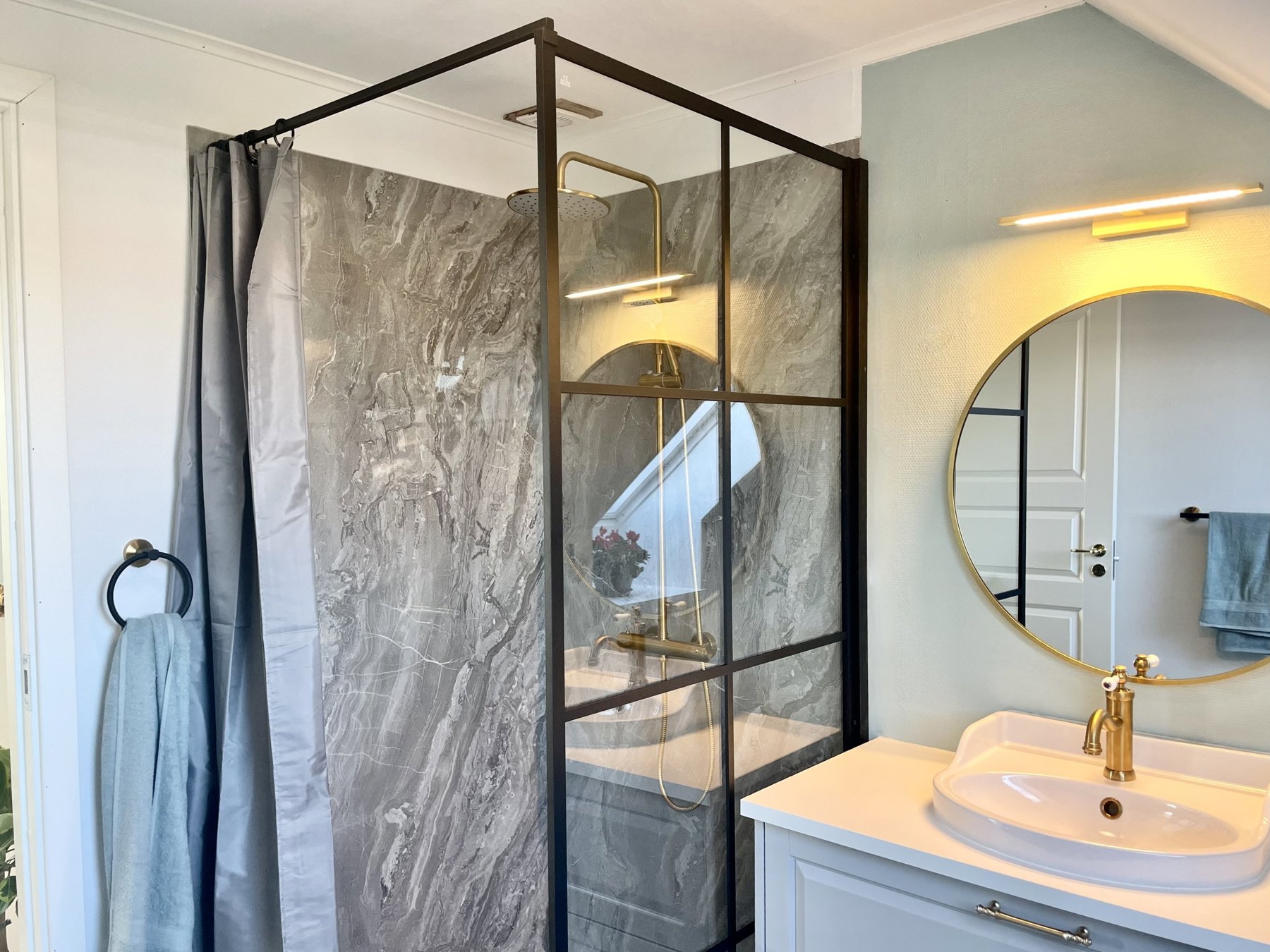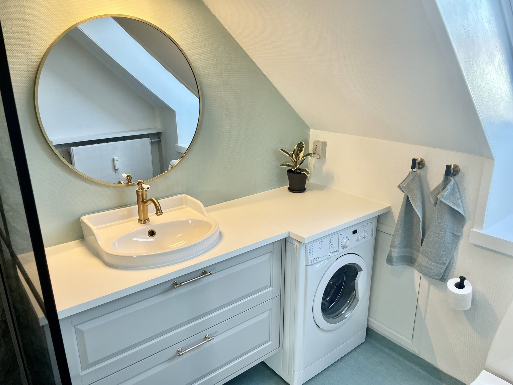 Indretningen er først og fremmest helt ny, og udført i lettere romantisk stil. Køkkenet er forholdsvist rummeligt og i åben forbindelse med entré og fordelingsgang. Der kan etableres en mindre spiseplads, men stuen er i sig selv også stor nok til en spiseafdeling udover indretningen som dagligstue. Et fantastisk lysindfald kommer bl.a. fra en ca. 3 meter lang sydvendt kvist med en kraftig vindueskarm, der i øvrigt er dyb nok til indretning som et slags møbel – eller bare et hyggeligt sted, hvor man slapper af, mens øjnene glider langsom hen over byens tage og ned over havneområdet, hvor de til sidst får et lille “kik” af Lillebælt med Fyn og Strib i baggrunden.