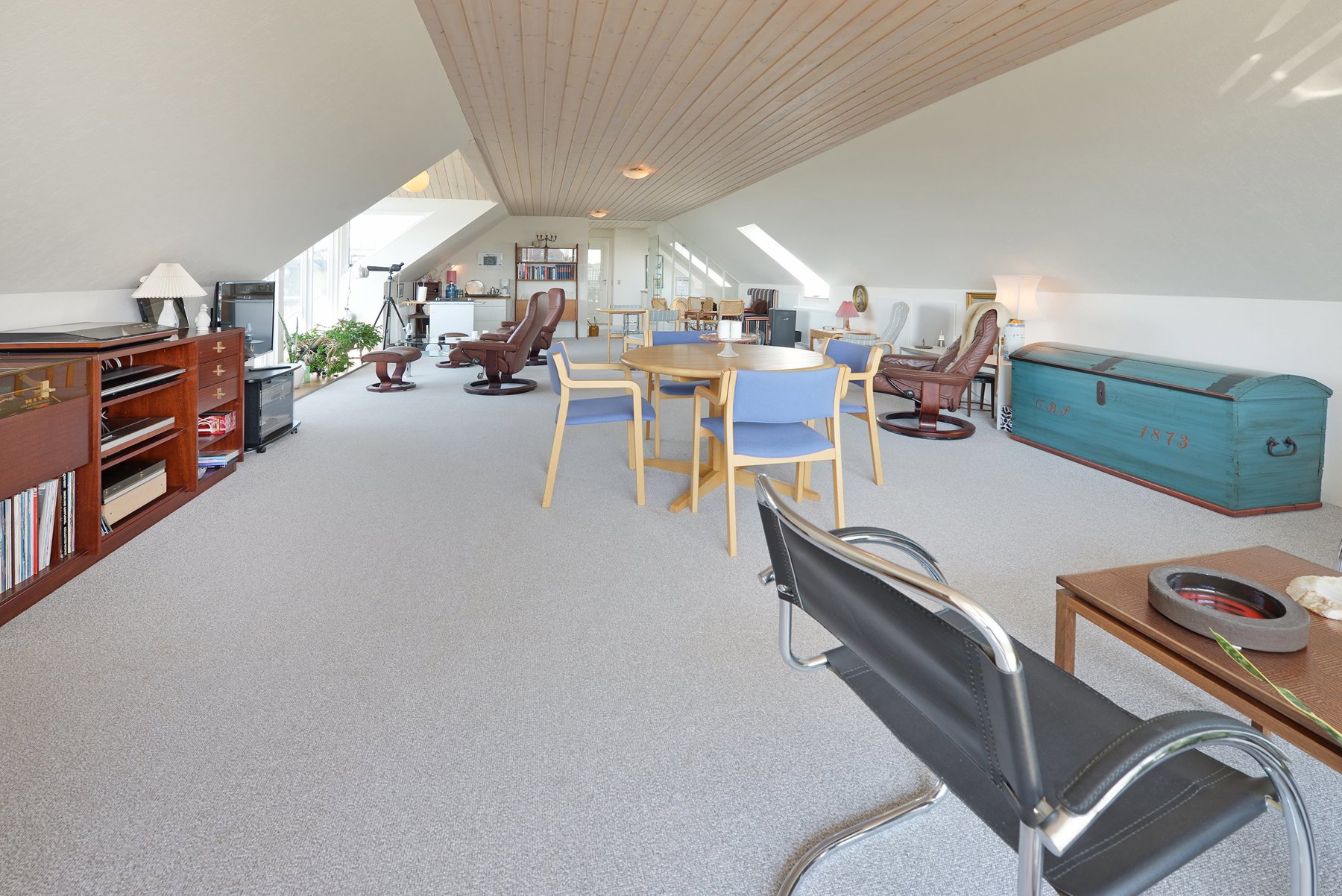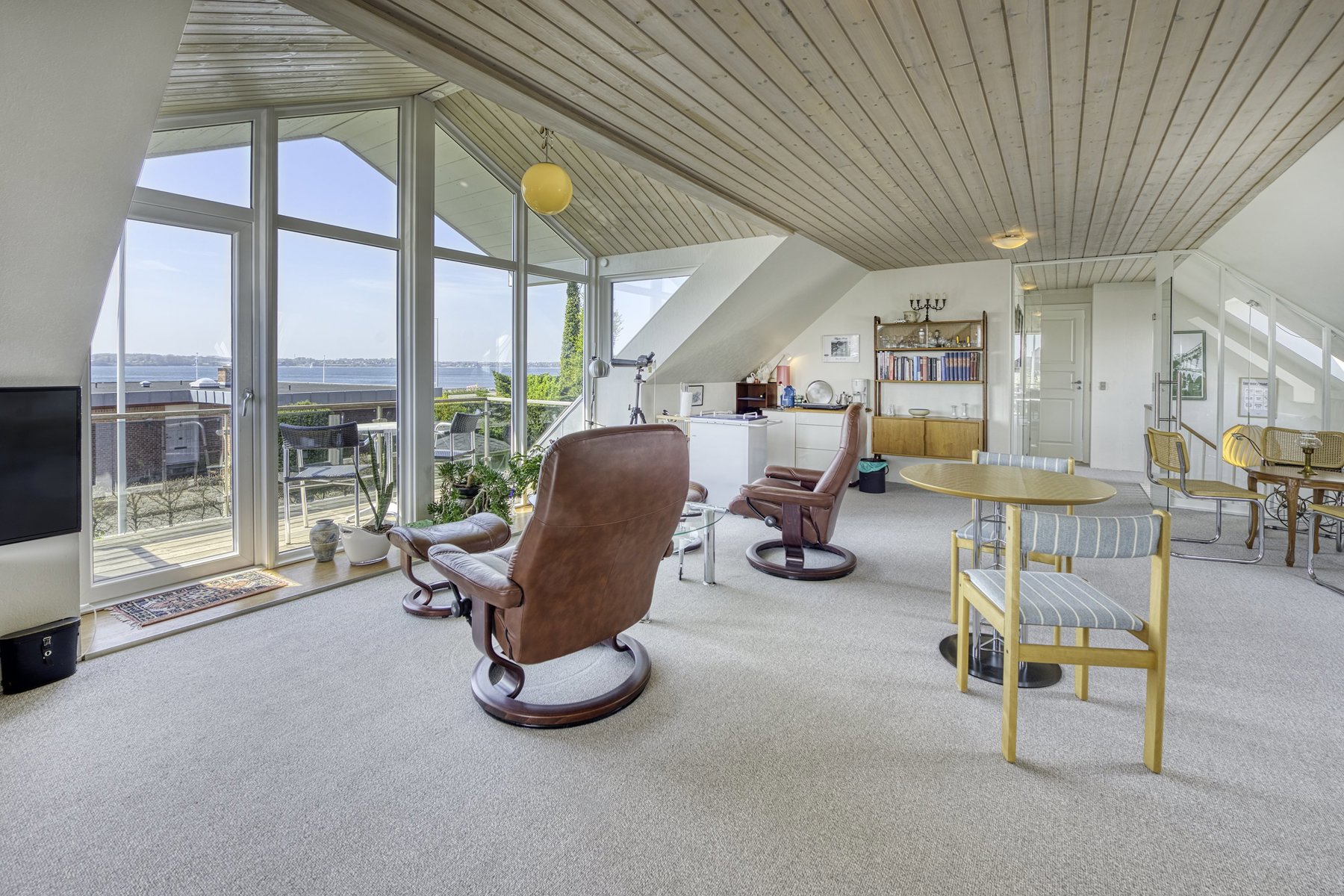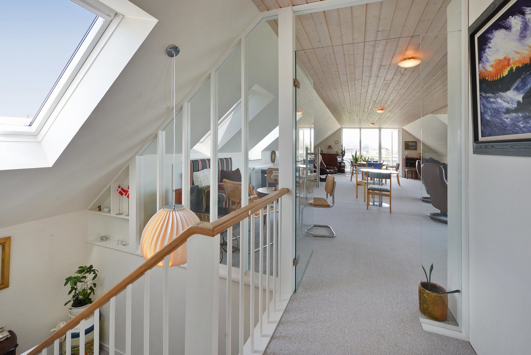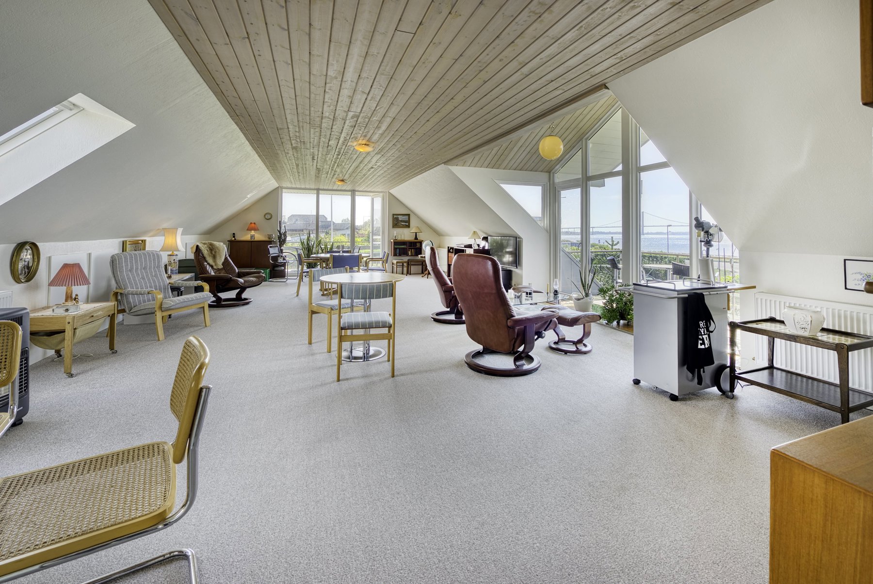 1. salen alene er på 92 kvm. Den er først og fremmest indrettet med soveværelse og badeværelse. Resten er indrettet som een stor stue med udgang til 2 altaner. Den ene altan findes i husets endegavl og en nyere altan er indbygget i en stor kvist med glasparti mod bæltet. Kvisten er en ændring som nuværende ejer har tilført huset nogenlunde samme tid som taget blev skiftet. Det store rum åbner op for mange forskellige muligheder mht. indretning. Det kan være ekstra værelser, multirum for hele familien, arbejdslokaler til liberalt erhverv – bestem selv hvordan du vil anvende et lokale på ca. 65 kvm med panoramaudsigt over Lillebælt.