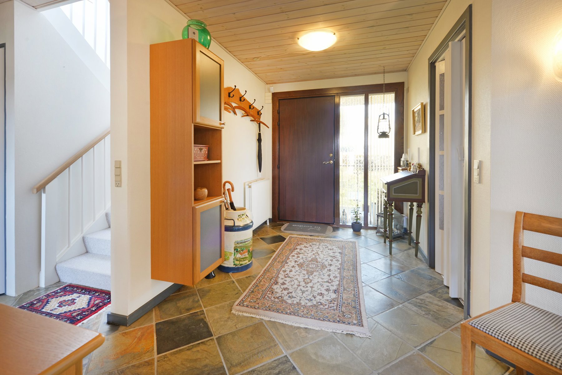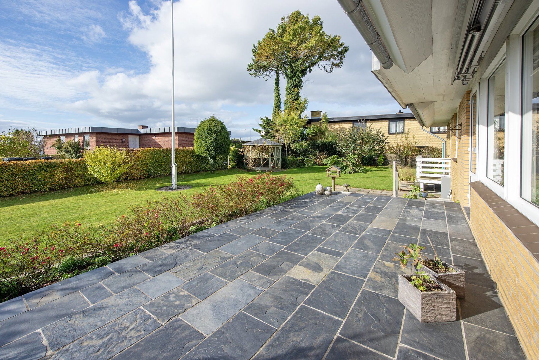 Stueplanet indeholder entré med kinesisk skiffergulv, køkken i mahogni og granit, stue med flot parketgulv, 2 værelser med udsigt til bæltet og et rummeligt badeværelse. Stuen er meget stor og her er rig mulighed for at udvide nuværende køkken til køkken/alrum og herefter stadig ha’ en god og rummelig stue foruden. Fra stuen er der udgang til en stor syd/vest vendt og meget flot terrasse med skifferbelægning. Herfra kan udsigten nydes direkte mod Lillebæltsbroen og bæltet.