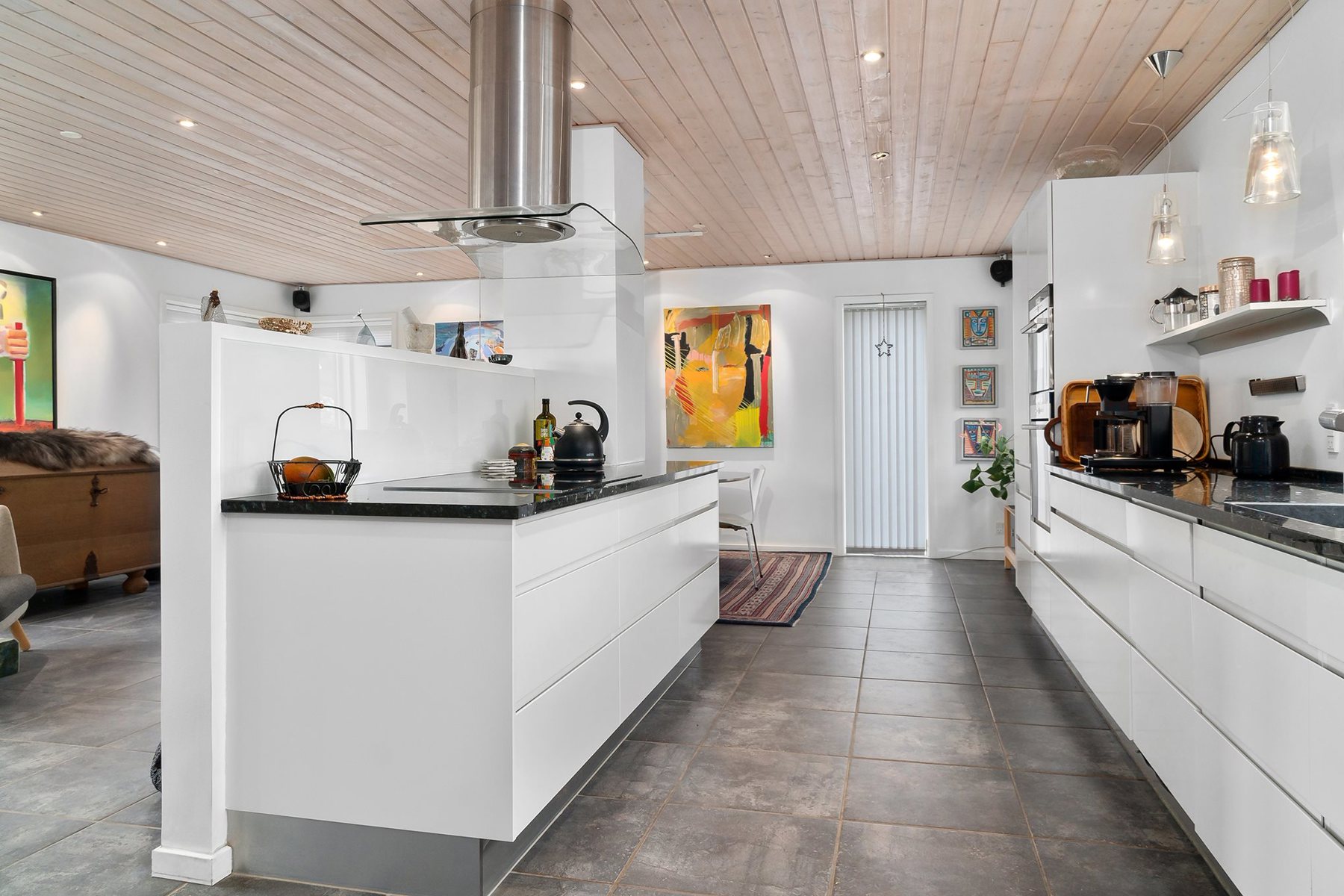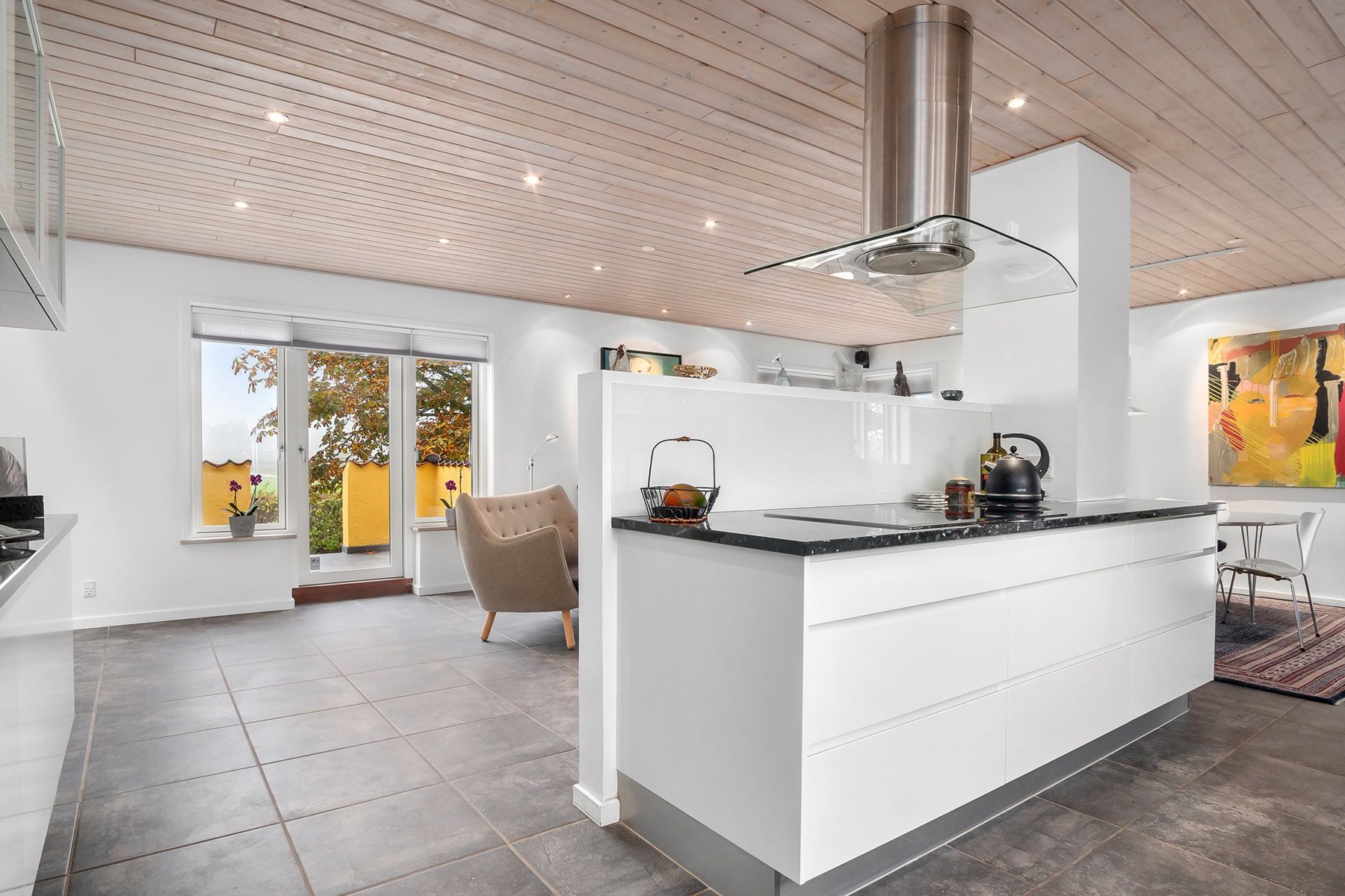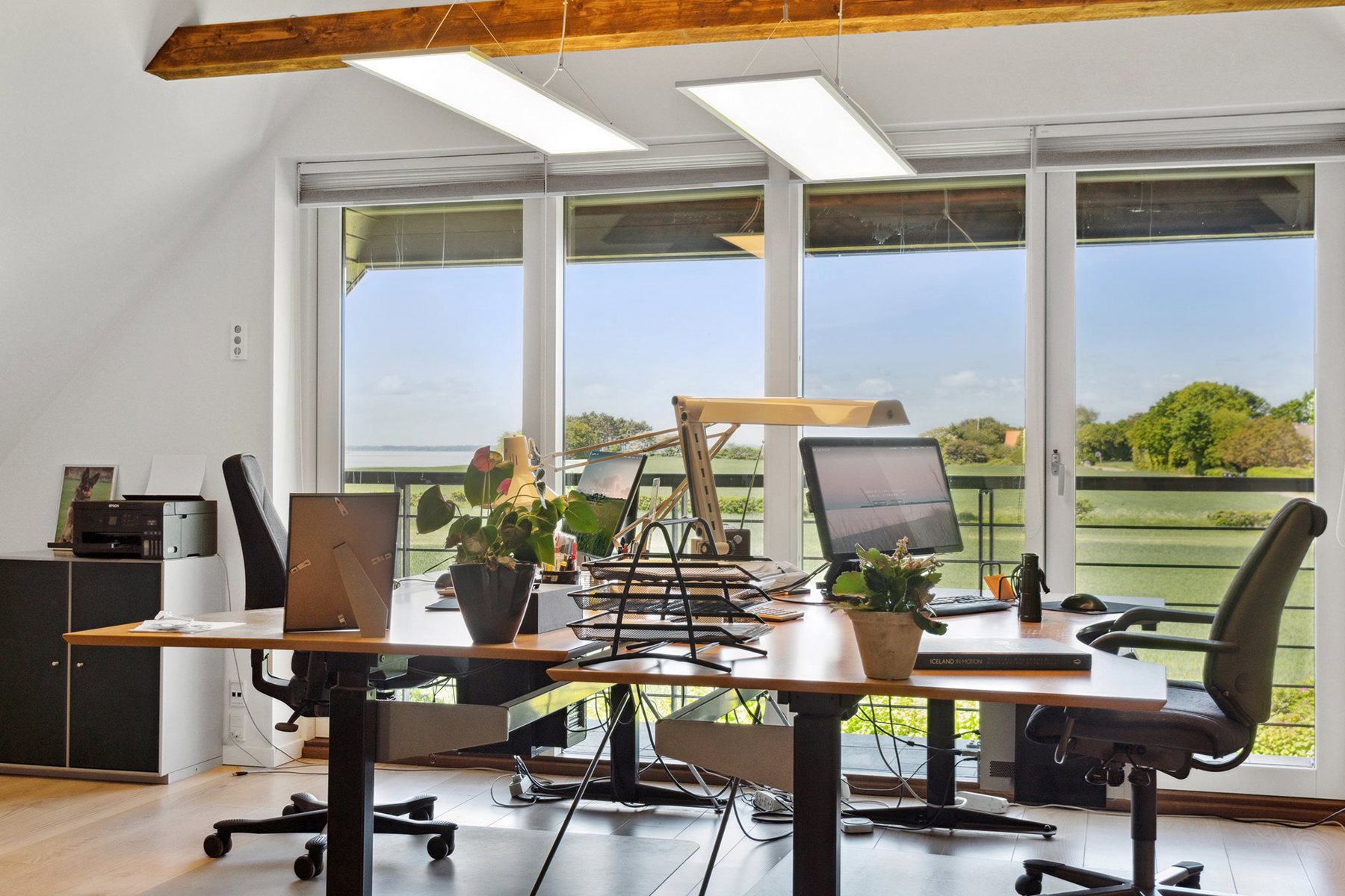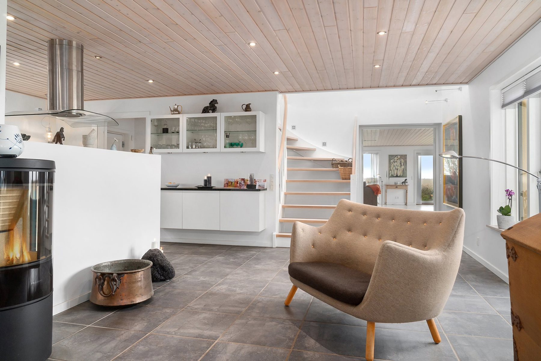Stueetagen er indrettet med stort køkken-alrum på ca. 50 kvm. Her er alt hvad et moderne køkken bør indeholde og designet er enkelt og tidløst. Mod vest er der udgang til en lukket terrasse med kik ned over markerne mod Lillebælt. Mod syd er der i stueetagen indrettet en stor og meget lys stue (ca. 50 kvm) med høje vinduespartier mod syd og vest samt udgang til haven. Ud over soveværelse og ekstra badeværelse findes der i stueetagen direkte indgang til driftslængen. Her er flere rum indrettet med muligheder for kontor, klinik eller anden form for erhverv. Måske har man en pladskrævende hobby eller andet, hvor det er praktisk at ha’ direkte adgang fra privatboligen samtidig med, at der hurtigt og let kan lukkes af. Det samlede areal af denne del af driftslængen er på 61 kvm og der er naturligvis indlagt fiber til lynhurtigt internet.