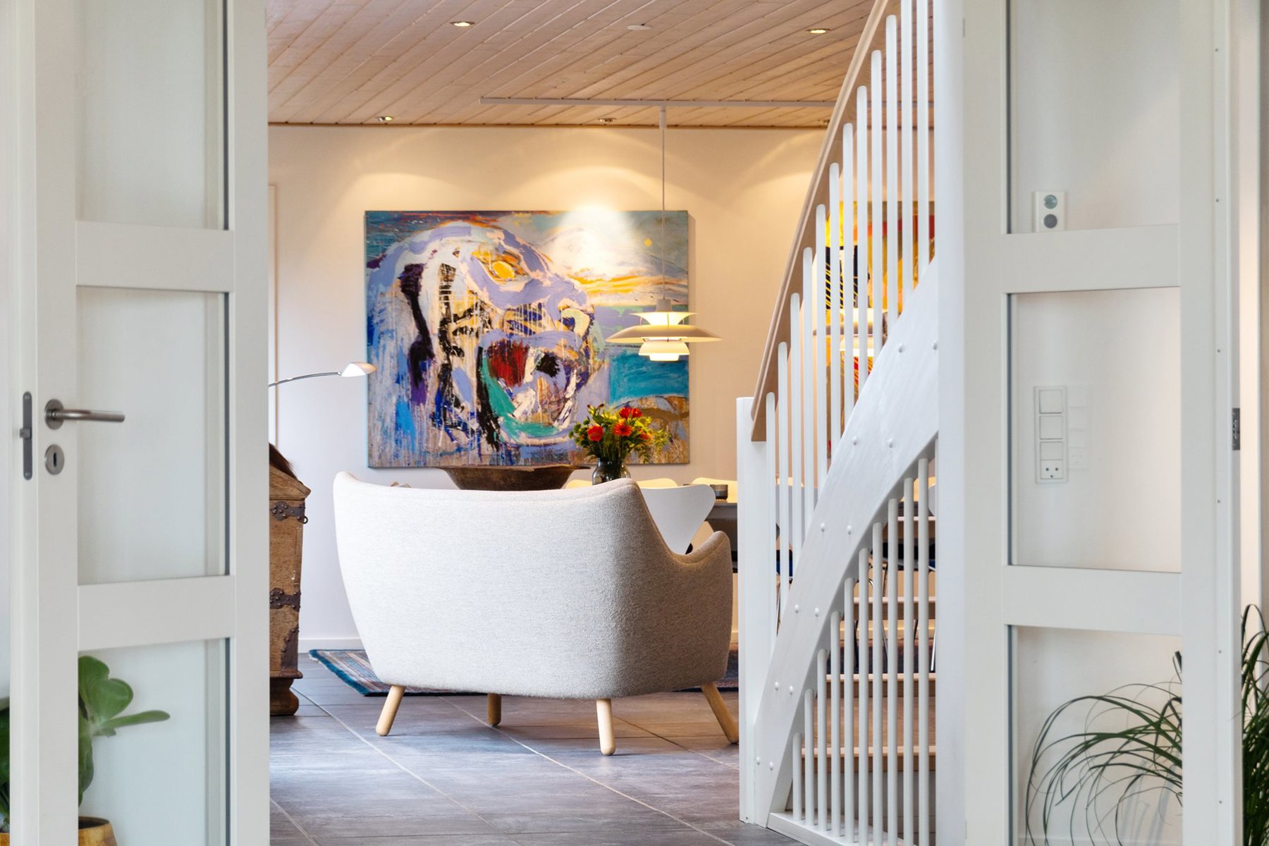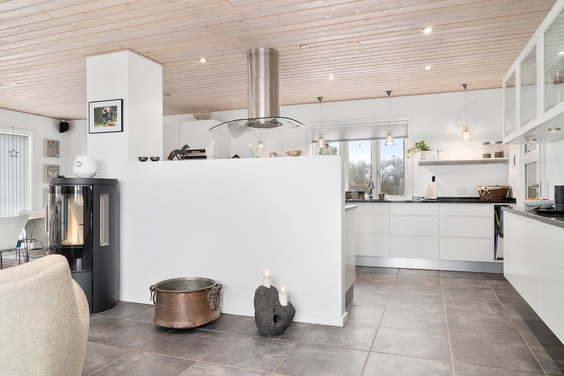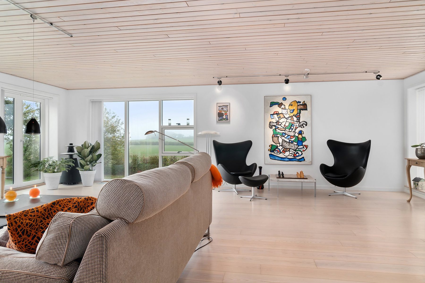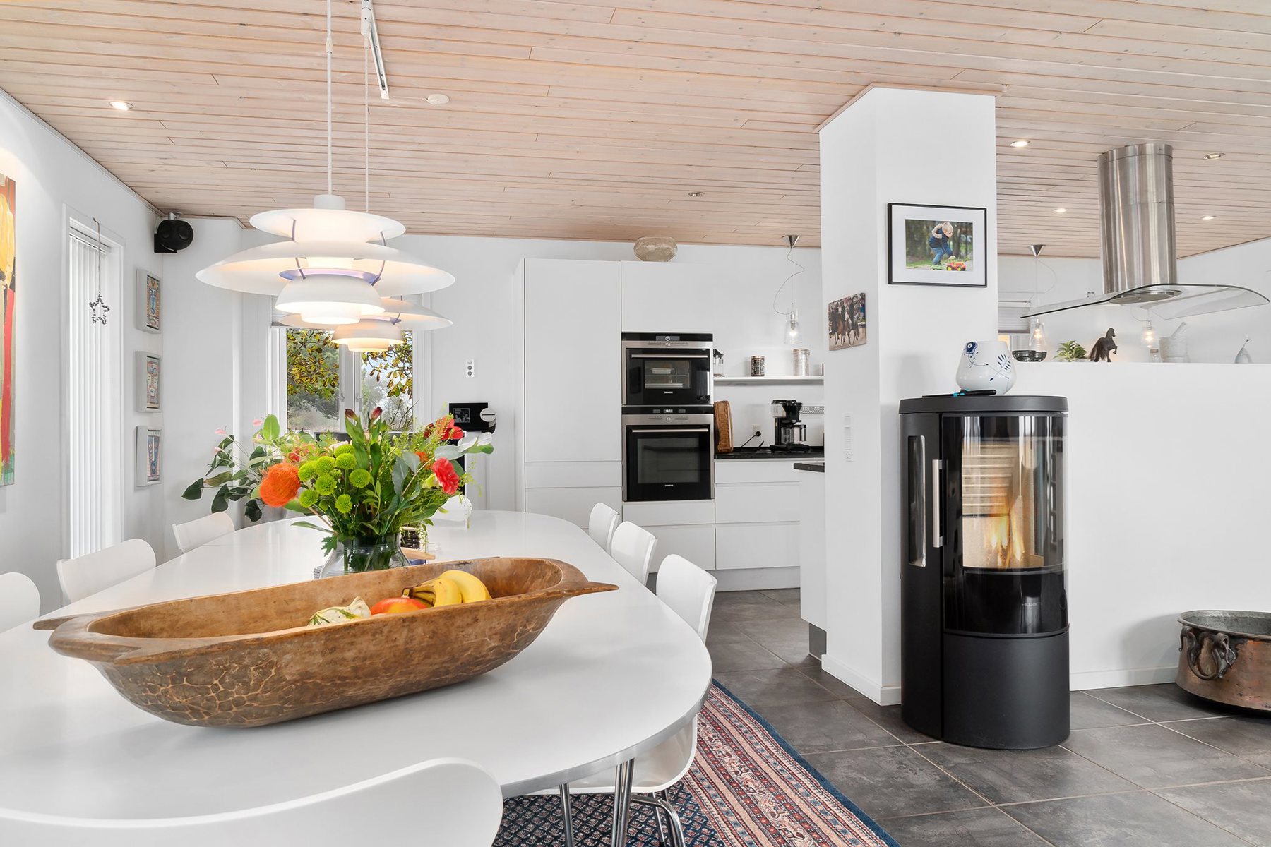 Stueetagen er indrettet med stort køkken-alrum på ca. 50 kvm. Her er alt hvad et moderne køkken bør indeholde og designet er enkelt og tidløst. Mod vest er der udgang til en lukket terrasse med kik ned over markerne mod Lillebælt. Mod syd er der i stueetagen indrettet en stor og meget lys stue (ca. 50 kvm) med høje vinduespartier mod syd og vest samt udgang til haven. Ud over soveværelse og ekstra badeværelse findes der i stueetagen direkte indgang til driftslængen. Her er flere rum indrettet med muligheder for kontor, klinik eller anden form for erhverv. Måske har man en pladskrævende hobby eller andet, hvor det er praktisk at ha’ direkte adgang fra privatboligen samtidig med, at der hurtigt og let kan lukkes af. Det samlede areal af denne del af driftslængen er på 61 kvm og der er naturligvis indlagt fiber til lynhurtigt internet.