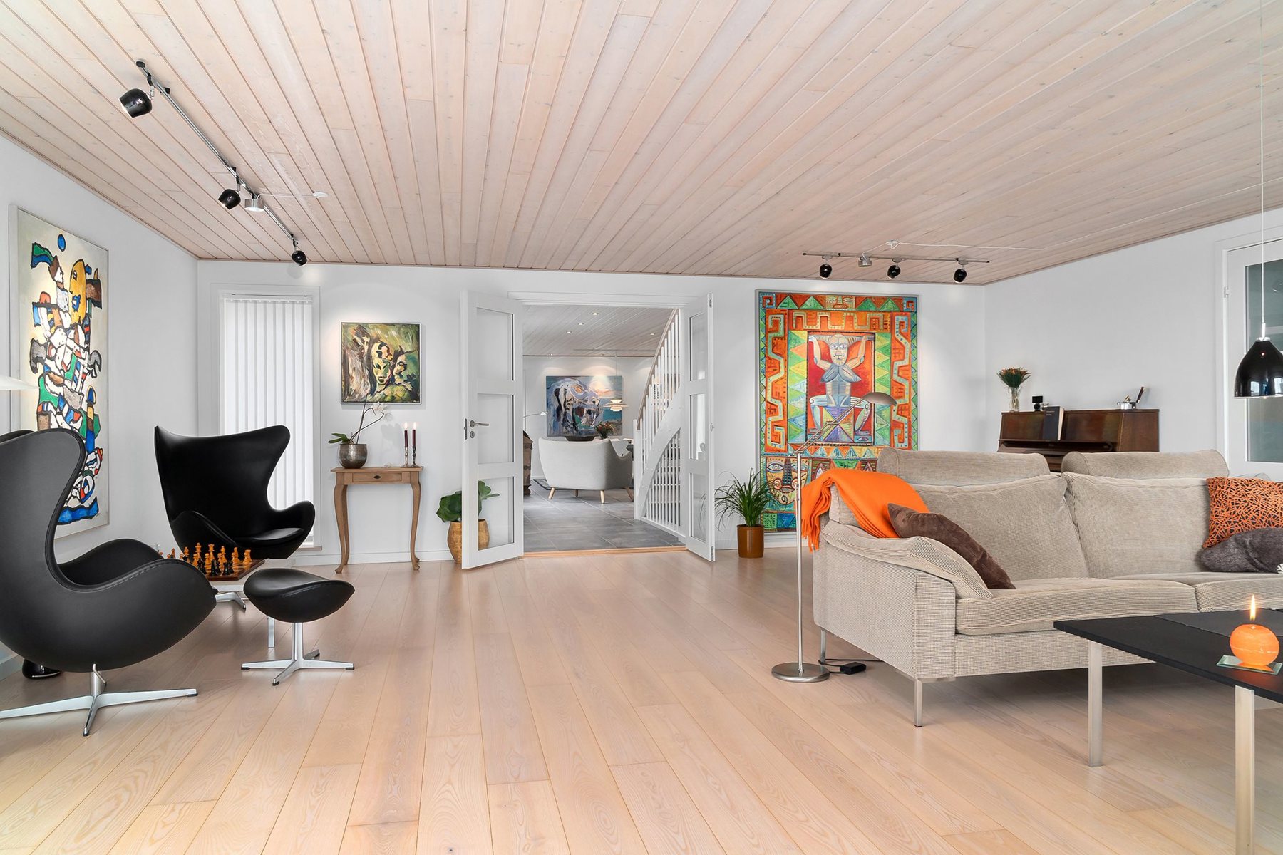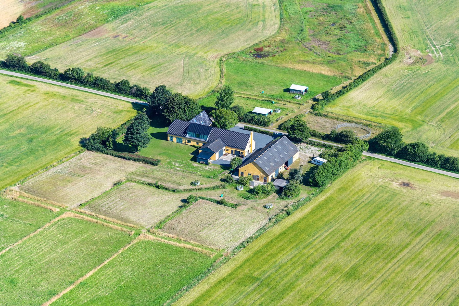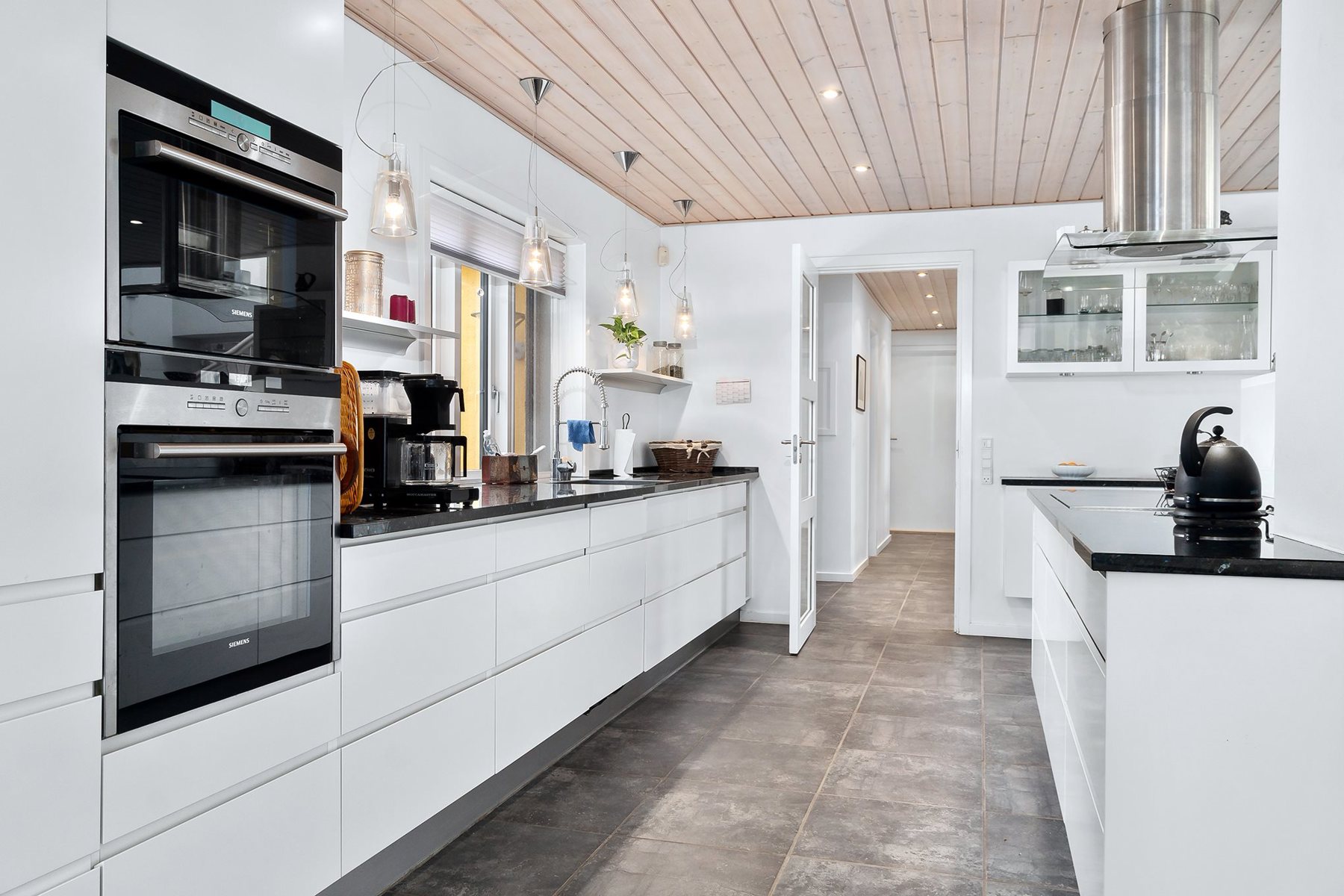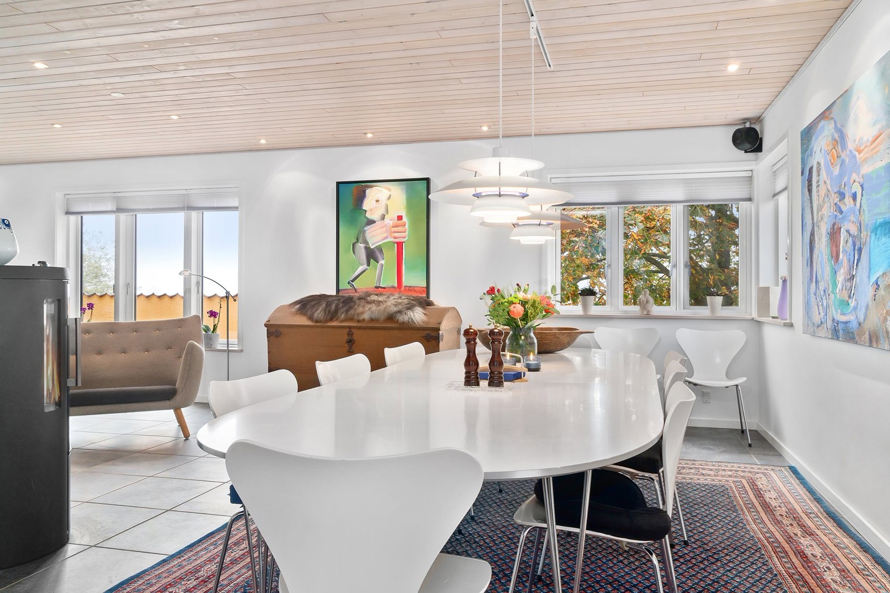 Stueetagen er indrettet med stort køkken-alrum på ca. 50 kvm. Her er alt hvad et moderne køkken bør indeholde og designet er enkelt og tidløst. Mod vest er der udgang til en lukket terrasse med kik ned over markerne mod Lillebælt. Mod syd er der i stueetagen indrettet en stor og meget lys stue (ca. 50 kvm) med høje vinduespartier mod syd og vest samt udgang til haven. Ud over soveværelse og ekstra badeværelse findes der i stueetagen direkte indgang til driftslængen. Her er flere rum indrettet med muligheder for kontor, klinik eller anden form for erhverv. Måske har man en pladskrævende hobby eller andet, hvor det er praktisk at ha’ direkte adgang fra privatboligen samtidig med, at der hurtigt og let kan lukkes af. Det samlede areal af denne del af driftslængen er på 61 kvm og der er naturligvis indlagt fiber til lynhurtigt internet.