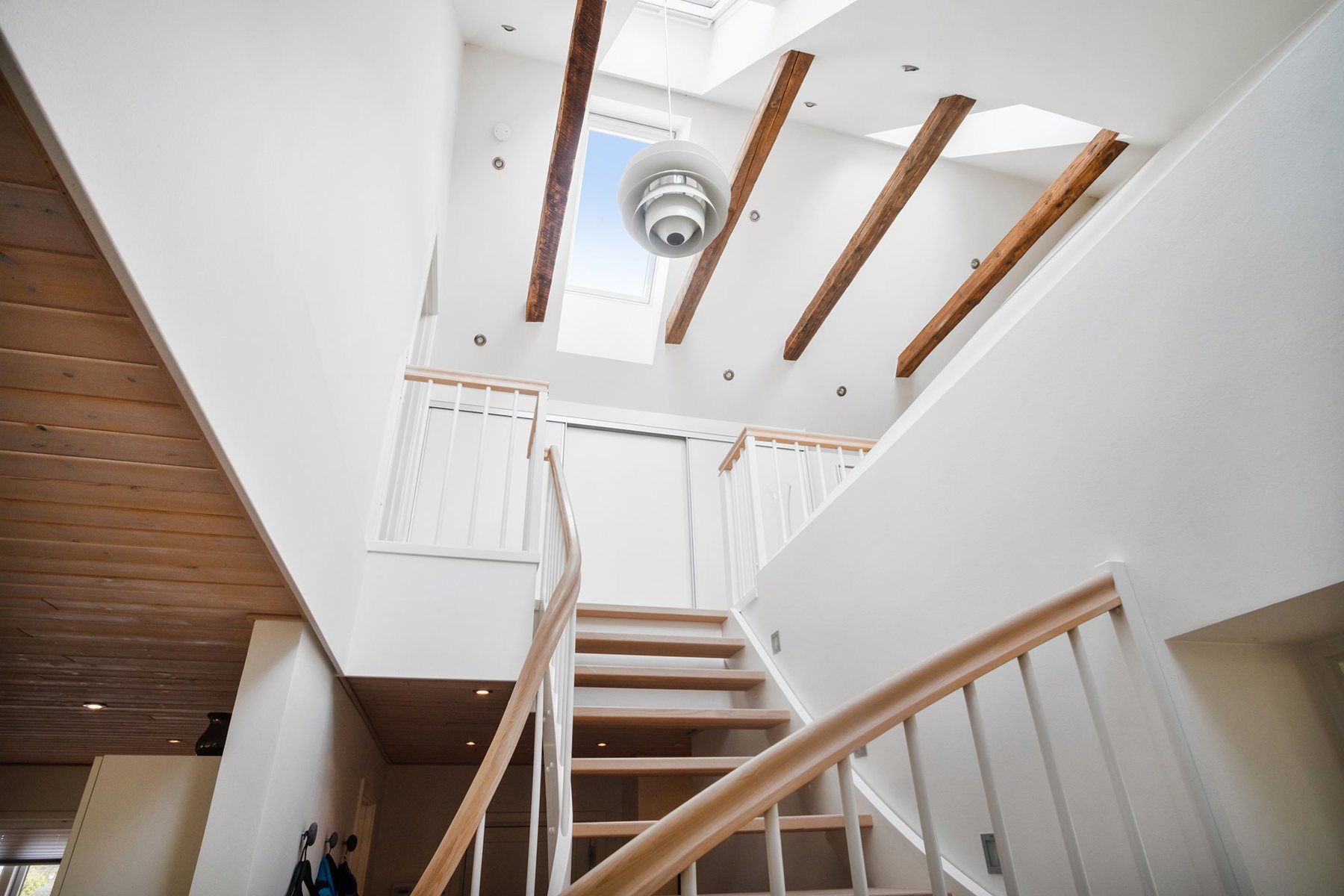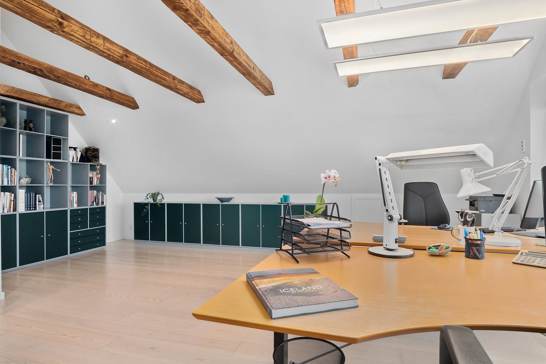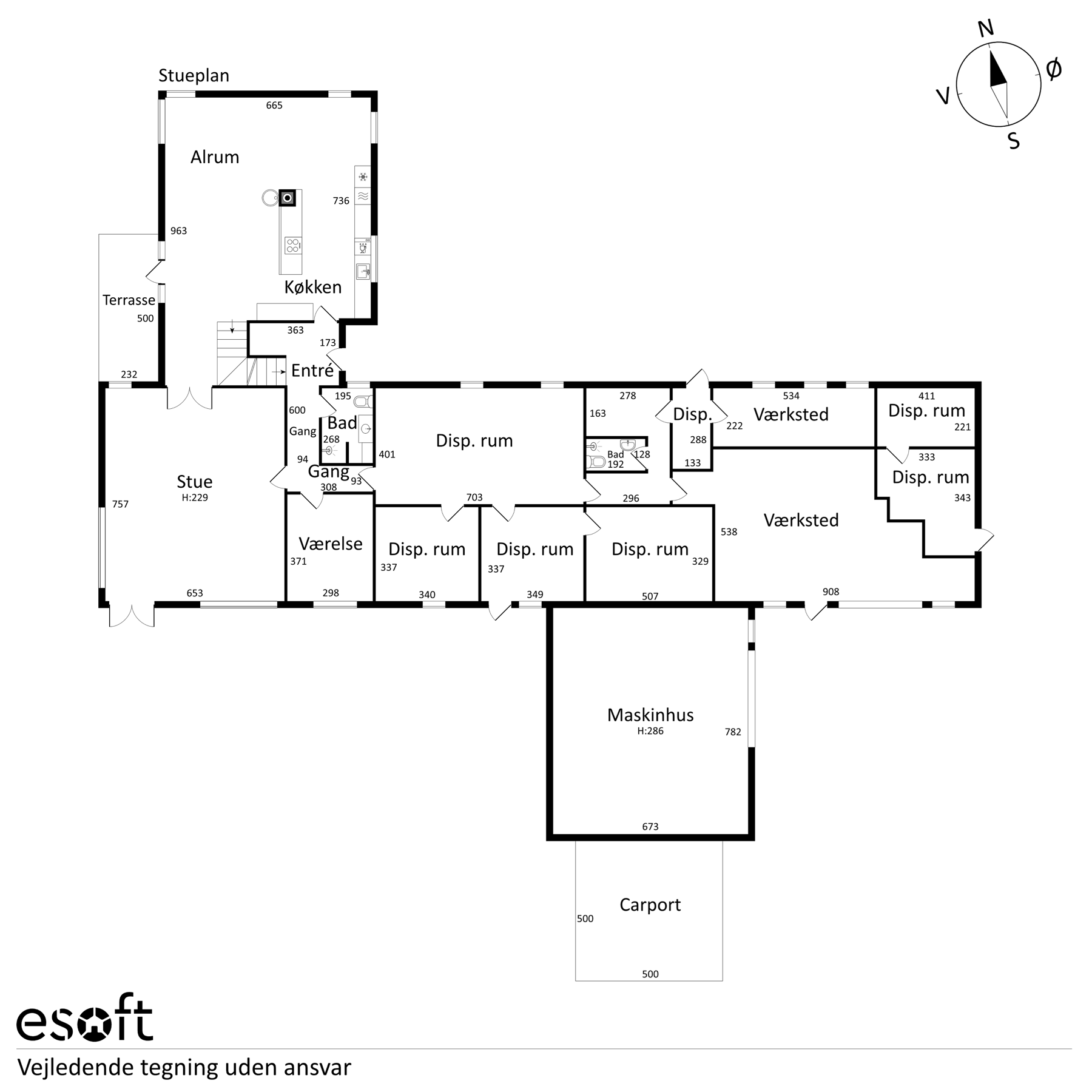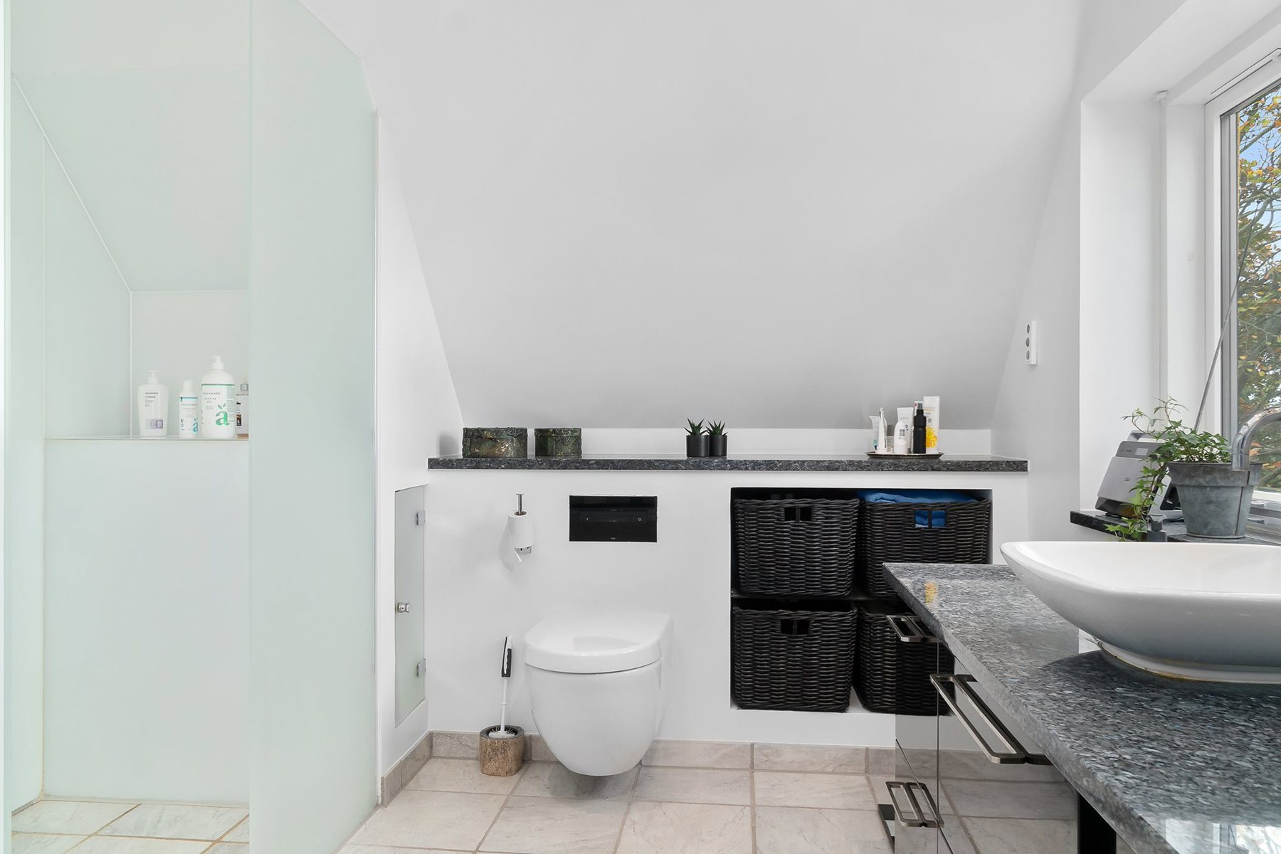 Stueetagen er indrettet med stort køkken-alrum på ca. 50 kvm. Her er alt hvad et moderne køkken bør indeholde og designet er enkelt og tidløst. Mod vest er der udgang til en lukket terrasse med kik ned over markerne mod Lillebælt. Mod syd er der i stueetagen indrettet en stor og meget lys stue (ca. 50 kvm) med høje vinduespartier mod syd og vest samt udgang til haven. Ud over soveværelse og ekstra badeværelse findes der i stueetagen direkte indgang til driftslængen. Her er flere rum indrettet med muligheder for kontor, klinik eller anden form for erhverv. Måske har man en pladskrævende hobby eller andet, hvor det er praktisk at ha’ direkte adgang fra privatboligen samtidig med, at der hurtigt og let kan lukkes af. Det samlede areal af denne del af driftslængen er på 61 kvm og der er naturligvis indlagt fiber til lynhurtigt internet.