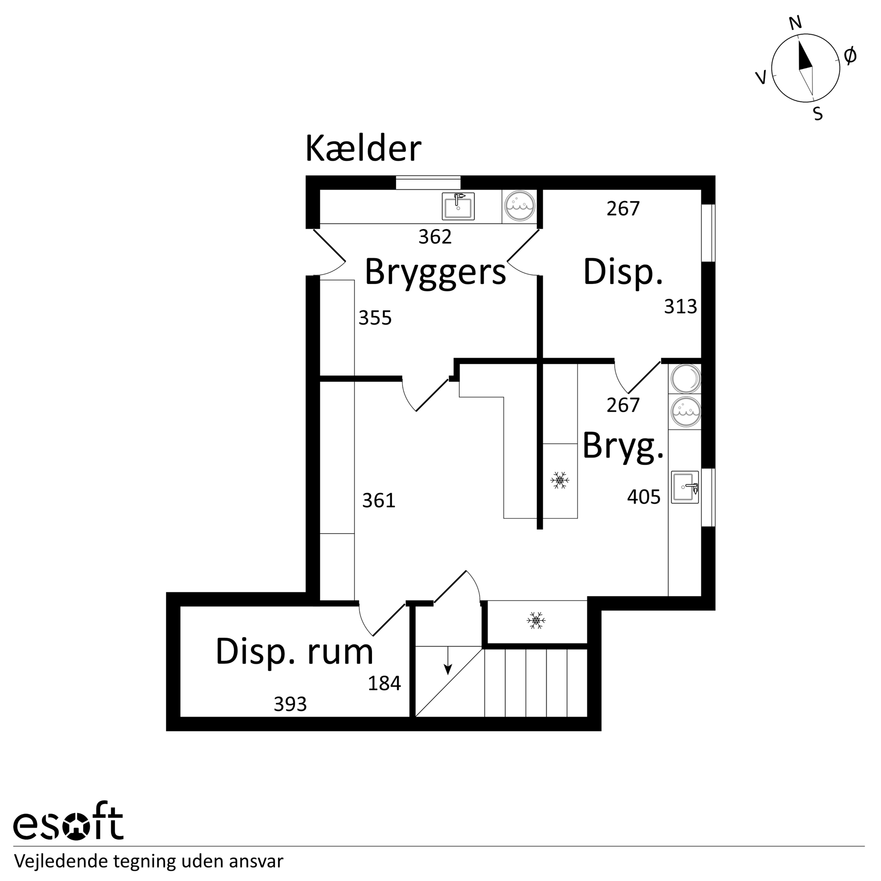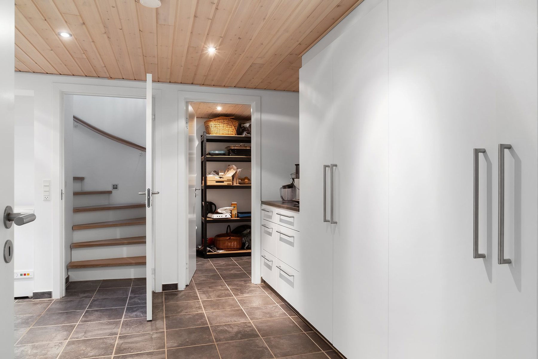 Fra entré er der en flot trappe med indbyggede vægspots over trinene ned til kælderetagens 72 kvm. Her findes viktualierum, vaskerum, opbevaringsrum – alle med en overdådighed af indbygningsskabe, masser af bord- og arbejdsplads og overalt de samme flotte klinker på gulvene. Fra det ene vaskerum er der ligeledes udgang til haven. En virkelig lækker kælder, hvor der er plads til god orden, reel lofthøjde og en lækker atmosfære. I et af rummene finder man husets varmesystem – jordvarmeanlægget som blev installeret i år 2011. Samtidig med den gennemgribende renovering der blev udført, blev der lavet gulvvarme overalt i stuehuset – både i kælder, stueetage og på 1. sal. Undtaget er dog viktualierum i kælder samt soveværelse og gæstetoilet i stueetagen.