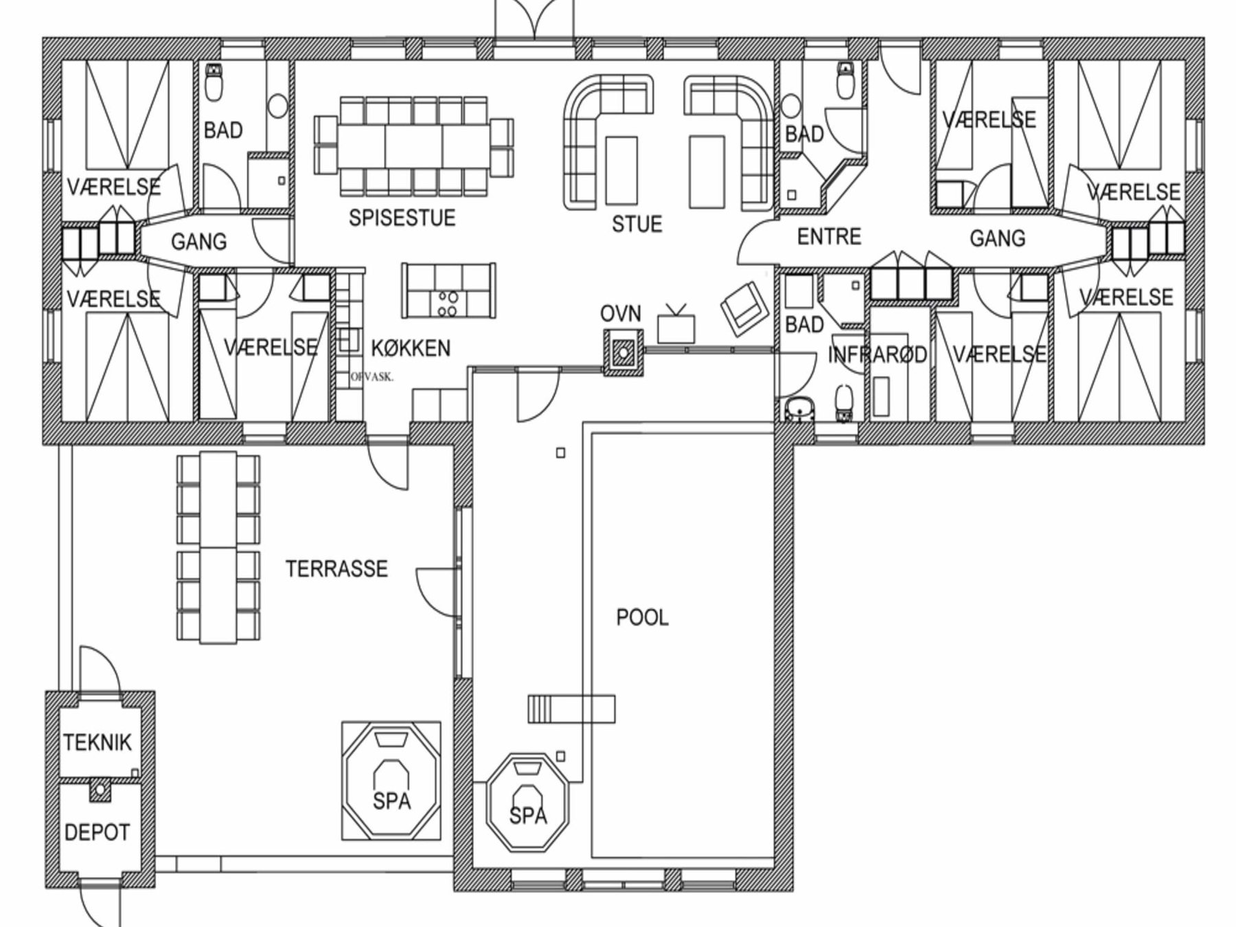 Udenfor på den store terrasse er der ligeledes opsat et spa-bad til 7 personer. Huset er indrettet med 7 soveværelser, hvoraf 4 værelser er indrettet med dobbeltsenge, 1 værelse med 2 enkeltsenge og de sidste 2 værelser har hver 4 køjesenge – i alt plads til 18 personer.